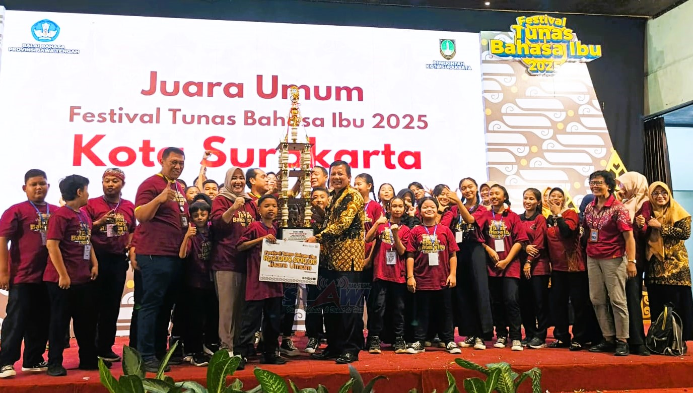Slawi FM – Kontingen dari Kota Surakarta berhasil meraih juara umum pada Festival Tunas Bahasa Ibu (FTBI) Tingkat Provinsi Jawa Tengah 2025 jenjang SD dan SMP yang diumumkan saat acara penutupan di Gedung Graha Saba Buana pada Kamis, (16/10/2025) kemarin.